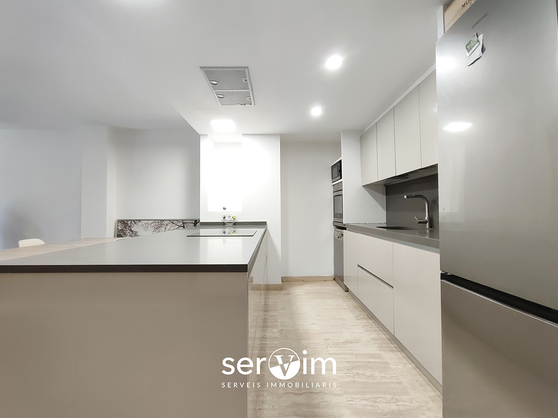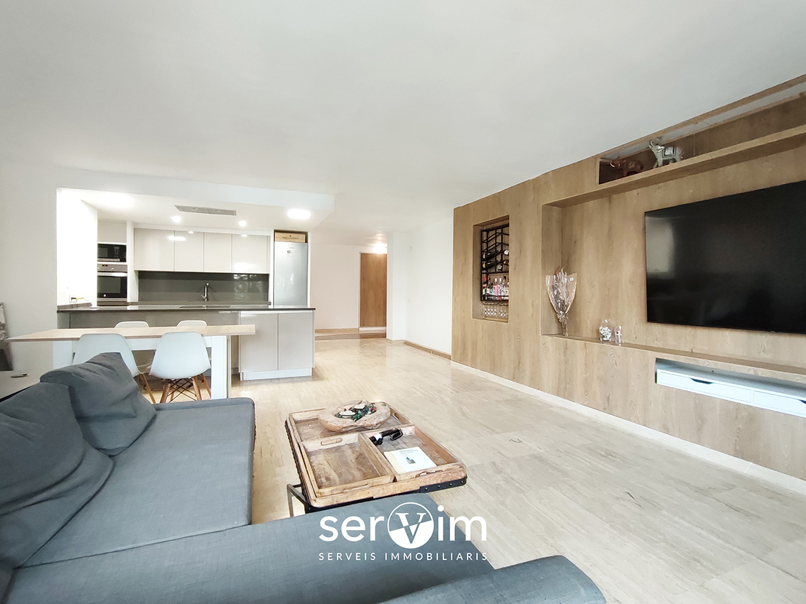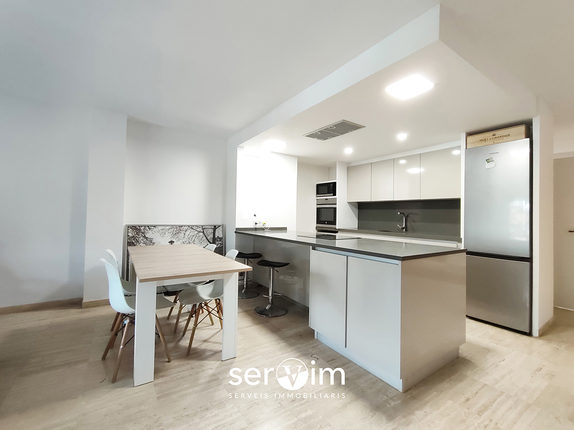 El pis ofereix un gran saló-menjador amb cuina oberta, un espai modern i funcional amb molta llum, ideal per gaudir en família o amb amics.
